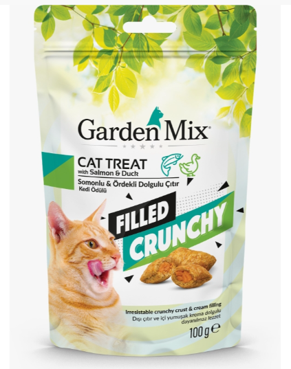 Garden Mix Filled Crunchy, kedinizin damak tadına hitap eden somon ve ördek aromalı iç dolgusu ile oldukça çekici bir lezzet sunar. Dışı ekstra çıtır kaplama, içi ise yumuşak krema dolgulu yapısıyla kedilerin severek tüketeceği bir ödül atıştırmalığıdır.