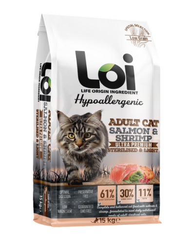 Loi Hipoalerjenik Sterilised Kısır Kedi Maması Somonlu ve Karidesli 15 Kg, kedinizin sağlıklı ve dengeli bir beslenme almasını sağlar ve uzun vadede onun genel sağlığını destekler. İçeriğindeki doğal bileşenler ve hipoalerjenik yapısı sayesinde, özellikle hassas kediler için ideal bir mama seçeneğidir.