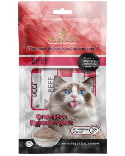 NOBILUS Dana Etli Kedi Krem Ödül Maması kedilerin damak tadına hitap eden yoğun et aroması ve yumuşak krem dokusuyla günlük ödül rutinlerini daha keyifli hale getirmek için geliştirilmiştir. 5 x 15 gr’lık pratik paket yapısı sayesinde tazeliğini korur ve her kullanımda ideal porsiyon sunar. Krem formu özellikle çiğneme hassasiyeti olan kediler için kolay tüketim imkanı sağlar ve elde besleme sırasında da rahatlıkla kullanılabilir. Tahılsız ve renklendirici içermeyen formülü ile hassas yapılı kediler için güvenilir bir ödül alternatifi oluşturur.