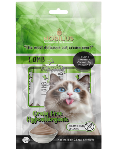 NOBILUS Kuzu Etli ve Bal Kabaklı Kedi Krem Ödül Maması ( 1 pakette 5 adet 15 gr ) doğal beslenme alışkanlıkları göz önünde bulundurularak geliştirilmiş premium bir ödül alternatifidir. Yumuşak krem formu sayesinde kolay tüketilir ve her yaştan kedi için iştah açıcı bir yapı sunar. Günlük ödül rutinlerinde tek başına verilebildiği gibi kuru ya da yaş mama üzerine eklenerek de kullanılabilir. Tahılsız yapısı ve renklendirici içermeyen formülü ile hassas sindirime sahip kediler için güvenli bir tercih oluşturur. Doğal et kaynakları ile desteklenen içeriği kedinizin hem lezzet hem de besin beklentisini karşılamayı amaçlar.