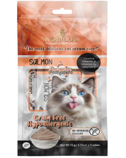 NOBILUS Somonlu ve Balkabaklı Kedi Krem Ödül Maması kedilerin günlük beslenme rutinini desteklemek ve ödül anlarını daha keyifli hale getirmek amacıyla hazırlanmış tamamlayıcı bir üründür Krem formda sunulması sayesinde her yaştan kedi tarafından kolaylıkla tüketilebilir Yumuşak dokusu ve yoğun aroması ile iştahı düşük ya da seçici kediler için ideal bir alternatiftir Günlük ödül olarak verilebildiği gibi ana mamanın üzerine eklenerek tüketimin artırılmasına da yardımcı olur