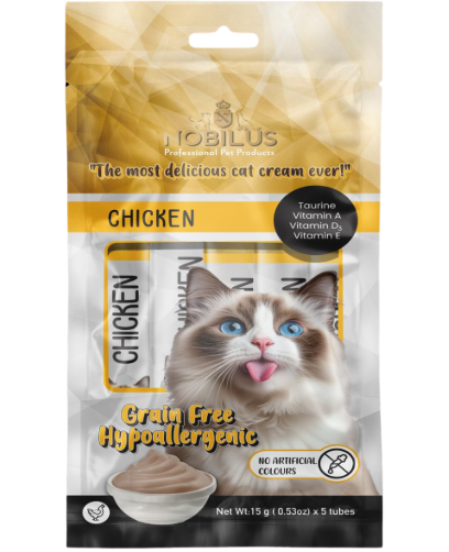 NOBILUS Tavuklu Kedi Krem Ödül Maması kedilerin severek tükettiği tavuk lezzetini yumuşak krem formuyla bir araya getiren premium bir ödül alternatifidir. Yüksek tavuk oranı sayesinde doğal protein ihtiyacını desteklerken tahılsız ve renklendiricisiz yapısı ile hassas beslenme gereksinimleri olan kediler için güvenli bir seçenek sunar. Krem dokusu sayesinde kolay tüketilir ve hem yavru hem yetişkin kediler için günlük ödül rutinlerine rahatlıkla dahil edilebilir. Tek başına ödül olarak verilebildiği gibi kuru ya da yaş mamanın üzerine eklenerek de kullanılabilir ve özellikle iştahsız kediler için cazip bir destek sağlar.