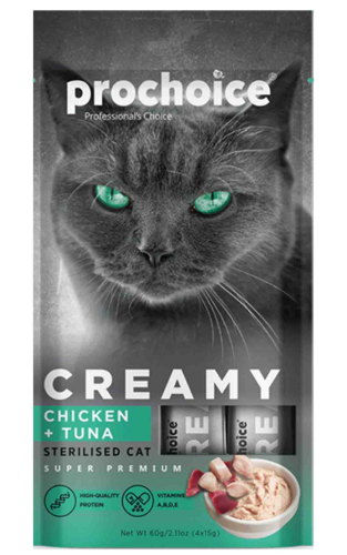 Prochoice creamy tuna balıklı ve tavuklu sıvı kedi ödül maması; Kediler için özel olarak üretilmiştir. Sıvı yapıda olup içeriğinde protein bakımından zengin tuna balığı ve tavuk bulunmaktadır. İçeriği sayesinde sağlıklı deri ve parlak tüy oluşumunu desteklemektedir. Kedi ödülü; Paket içerisinde 15gr ağırlığında 4 adet mama bulunmaktadır.