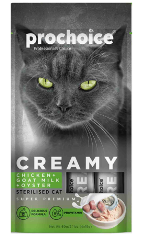 Prochoice creamy tavuklu ve keçi sütlü sıvı kedi ödül maması; Kediler için özel olarak üretilmiştir. Sıvı yapıda olup içeriğinde protein bakımından zengin tavuk ve keçi sütü bulunmaktadır. İçeriği sayesinde sağlıklı deri ve parlak tüy oluşumunu desteklemektedir. Kedinizin kas ve kemik yapısının güçlenmesine yardımcıdır. Kedi ödülü; Paket içerisinde 15gr ağırlığında 4 adet mama bulunmaktadır.
