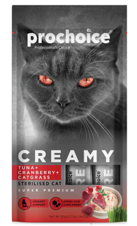 Prochoice creamy tuna ve cranberry sıvı kedi ödül maması; Kediler için özel olarak üretilmiştir. Sıvı yapıda olup içeriğinde protein bakımından zengin tuna balığı bulunmaktadır. İçeriği sayesinde sağlıklı deri ve parlak tüy oluşumunu desteklemektedir. Kısırlaştırılmış kediler için uygundur. Kedi ödülü; Paket içerisinde 15gr ağırlığında 4 adet mama bulunmaktadır.