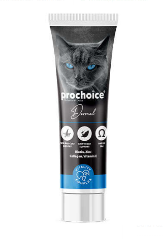 Kediler için tamamlayıcı yem, Pro Choice Dermal Paste Biotin, Çinko, Kolajen ve Keten tohum yağı ile kedilerin sağlıklı tüy ve cilt gelişimini desteklemeye yardımcı tamamlayıcı yemdir.Kediler için günlük 2,5 gr. (yaklaşık 1 cm) olarak doğrudan tüpten veya mamalarına eklenerek verilir.