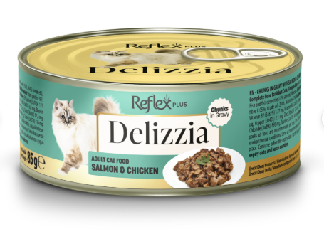 Reflex Plus Delizzia Sos İçinde Somonlu ve Tavuklu Parça Etli Yetişkin Kedi Konservesi 85gr