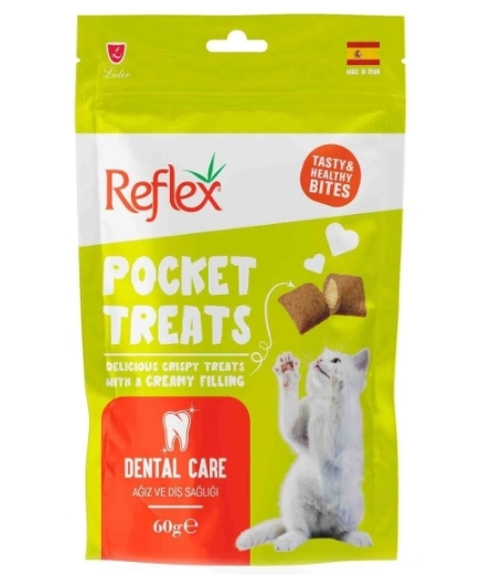 Reflex Pocket Treats, içeriğindeki özel formülü sayesinde diş sağlığını destekleyen bir yapıya sahiptir. Kediler için özel olarak formüle edilmiştir.