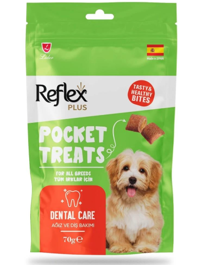Reflex Pocket Treats Dental, köpeğinize lezzetli bir mola sunarken ağız hijyenini korumasına yardımcı olan akıllı bir atıştırmalıktır.