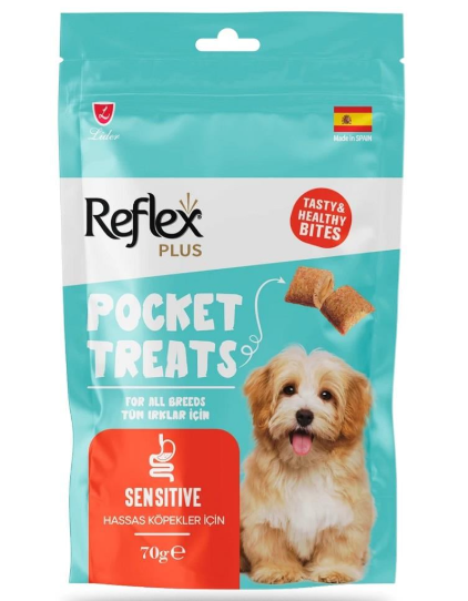 Reflex Pocket Treats Sensitive, sindirim sistemi hassasiyeti olan köpeklerin beslenme ihtiyaçları gözetilerek formüle edilmiş premium bir ödül mamasıdır. %20 oranındaki somon içeriği ve sindirim dostu bileşenleri ile köpeğinizi ödüllendirirken sağlığını da destekler.